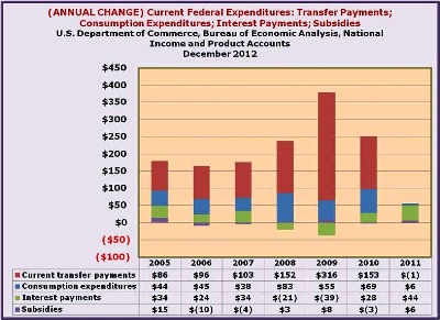 The pattern of federal government expenditures is significantly different than those of the state and local governments also referred to as municipalities. The large majority of federal government expenditures are transfer payments that are often nearly twice as large as are the federal government’s expenditures on goods and services or collective consumption and investment.