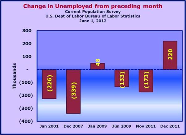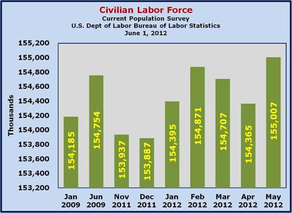 642,000 people were added to the Labor Force, while [only] 422,000 of those folks found jobs. The difference between the growth in the Labor Force and the growth in the Employed was 220,000 which added to the Unemployed and drove up the official U–3 unemployment rate from 8.1% in April to 8.2% in May. On a further note, the U–6 unemployment rate, which accounts for more discouraged and other marginally attached workers, rose from 14.5% to 14.8%.