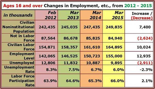 3) Change in Employed [adjusted for 66% Labor Force Participation Rate and 6.0% Unemployment Rate] = (148,659,000 – 139,869,000)