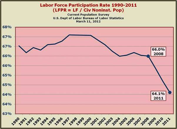 Again from 2008 through 2011, the Civilian Noninstitutional Population grew by 5,830,000 while the Civilian Labor Force contracted by 670,000 resulting in 6.5 million people being sidelined or added into the ‘Not in the Labor Force’ portion of the Civilian Noninstitutional Population (Civilian Noninstitutional Population = those not in the Labor Force and those in the Labor Force). The employment level dropped by 5,493,000 and unemployment increased by 4,823,000 contributing to an increase of unemployment rate by 3.2%, from 2008 to 2011.