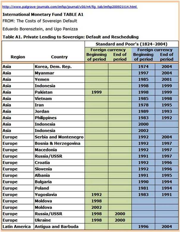 Lest you take sovereign risk lightly and the increased probability of the central governments defaulting on their national debt, here is a list of over eighty actual defaults as published by the International Monetary Fund (IMF).