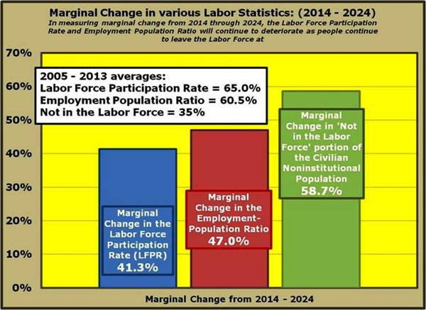 One of the dismissive reasons we’ve repeatedly heard explaining the fall in the Labor Force Participation Rate has to do with growing number of baby-boomers (born 1946 – 1964) charging toward that 65+ age group. The assertion is that the falling Labor Force Participation is owed primarily to the increased retirements. The problem with that reasoning is that the older population cohorts are actually staying in the Labor Force in record numbers – as we pointed out in previous newsletters. The real problem is that we have younger, able-bodied workers, who are simply not able to find employment. I bit later in this article, we will take a look at the breakdown between men and women in terms of what we call the ‘marginal’ Labor Force Participation Rate, where we look at the change in that measurement over a given period of time.
