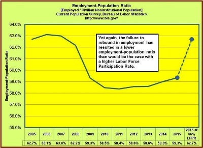In summary, from 2007 through 2015 the Labor Force grew by 4.0 million, while the Civilian Noninstitutional Population grew by 18.9 million, for a marginal LFPR of 21.2%. This illustrates how the LFPR fell from 66.0% in 2007 to 62.7% in 2015. Based on a 66.0% LFPR with the 18.9 million CNP growth from 2007- 2015, the total Labor Force would be 12.5 million. Since total employment increased by 4.0 million this equates with a shortfall of 8.4 million jobs at the end of 2015. The problem with regaining even some of those lost jobs require us to absorb the new monthly additions to the CNP (around 200,000) at a rate higher than the current 62.7%. The ideal would be to have a marginal Labor Force Participation Rate in excess of 100% for several months…years ahead. The good news was that the marginal Labor Force Participation Rates for October through December 2015 were well in excess of 100% (averaging 161%).