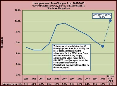 From 2000 through 2008, the Labor Force Participation Rate [Labor Force (Employed + Unemployed actively seeking employment) divided by the Civilian Noninstitutional Population) averaged 66.3%. Again, the Labor Force Participation Rate for 2015 was 62.7%. By simply applying 66.0% to the 2015 Civilian Noninstititutional Population: