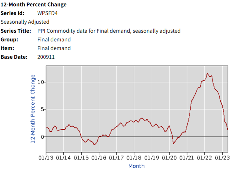 The Producer Price Index (PPI) from the Bureau of Labor Statistics came in at 1.2% in May, down from 2.3% in April.